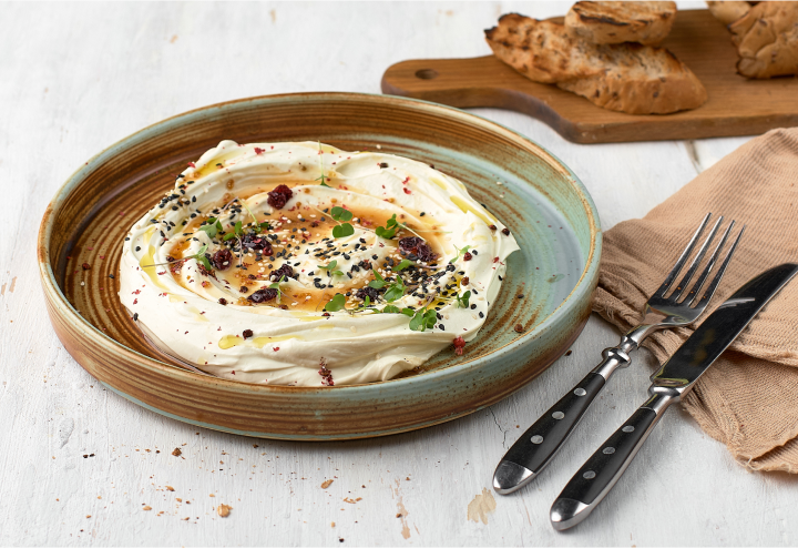 Ingrédients pour 4 personnes : 200 g de feta, 100 g de yaourt grec, 2 gousses d’ail, une poignée de baies de goji, 2 cuillères à soupe d’huile d’olive, de l’huile pimentée, des graines de sésame.