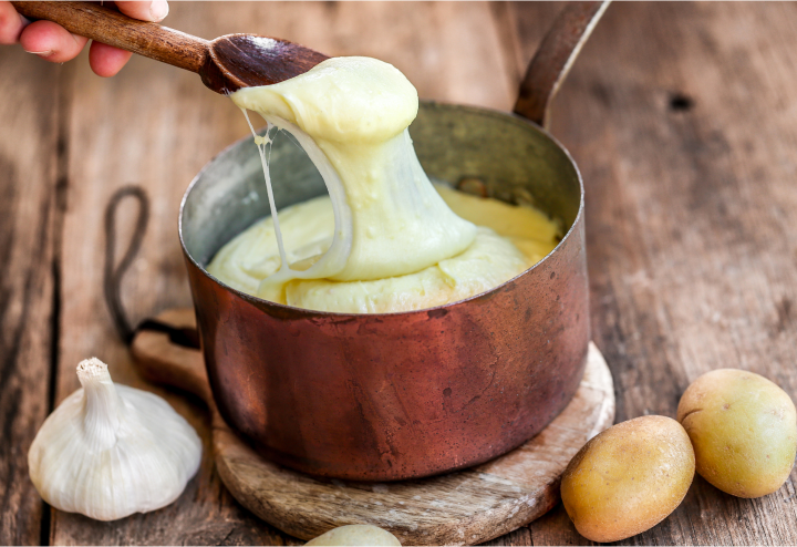 - Incorporez la tome petit à petit en soulevant bien la purée, elle doit filer ! Continuez de mélanger doucement sur feu doux jusqu’à l’obtention d’une texture lisse et élastique.