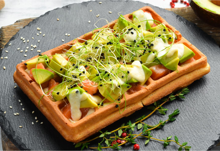 - Place au dressage : garnissez la gaufre de dés de saumon et d’avocat. Versez la sauce citronnée et ajoutez quelques graines germées sur le dessus.