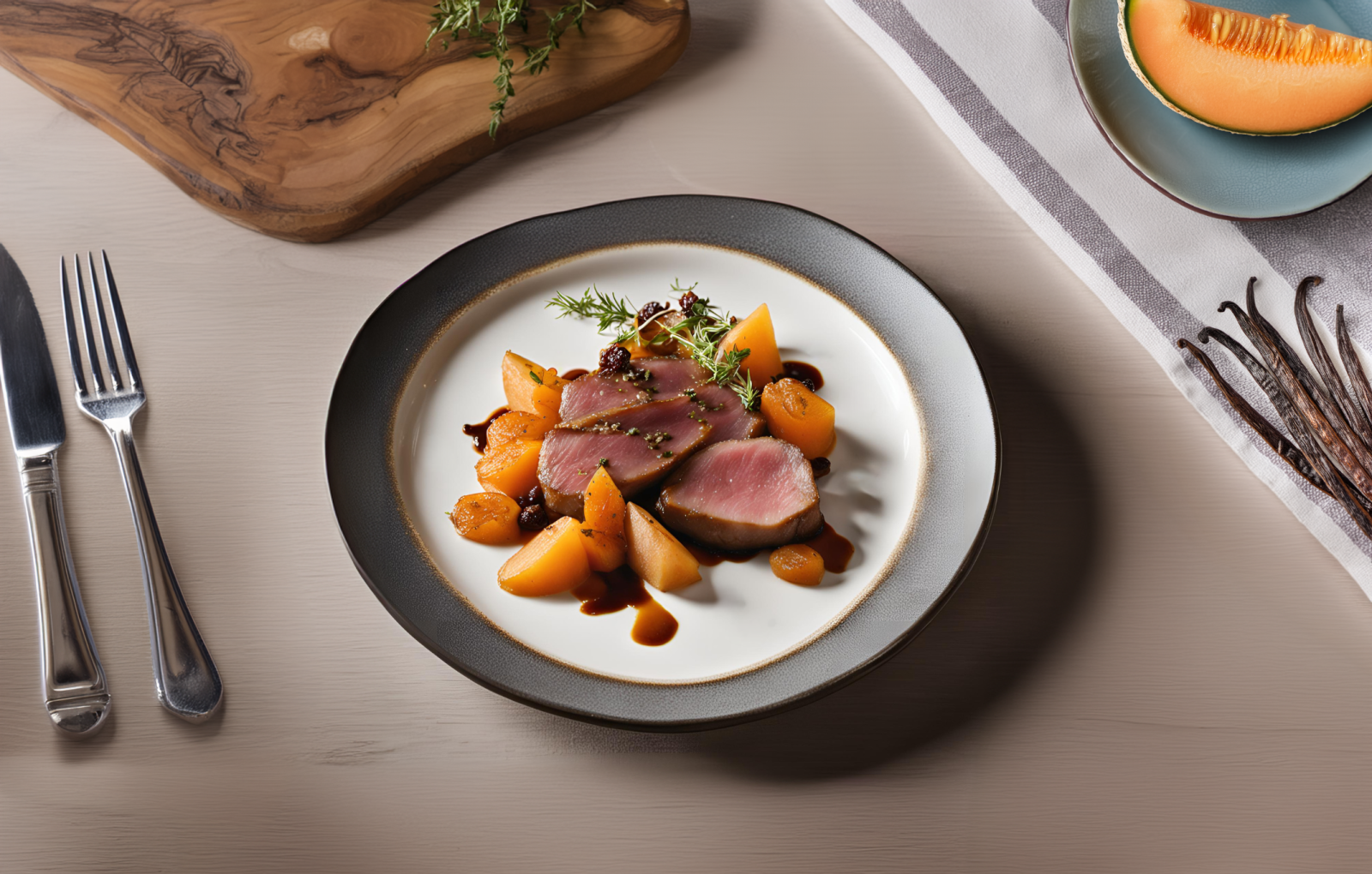 - Détaillez le magret de canard en tranches et servez avec le melon et le jus aux épices !