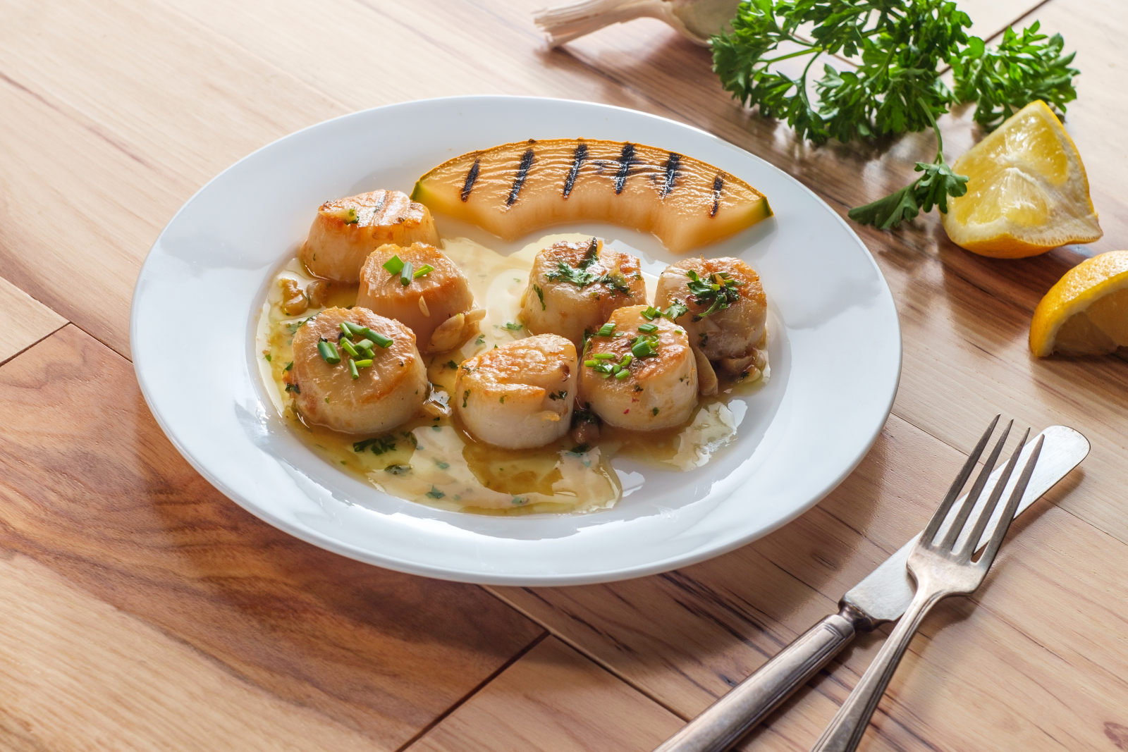 Le combo à tomber cet été : du melon grillé associé à des noix de Saint-Jacques fondantes.