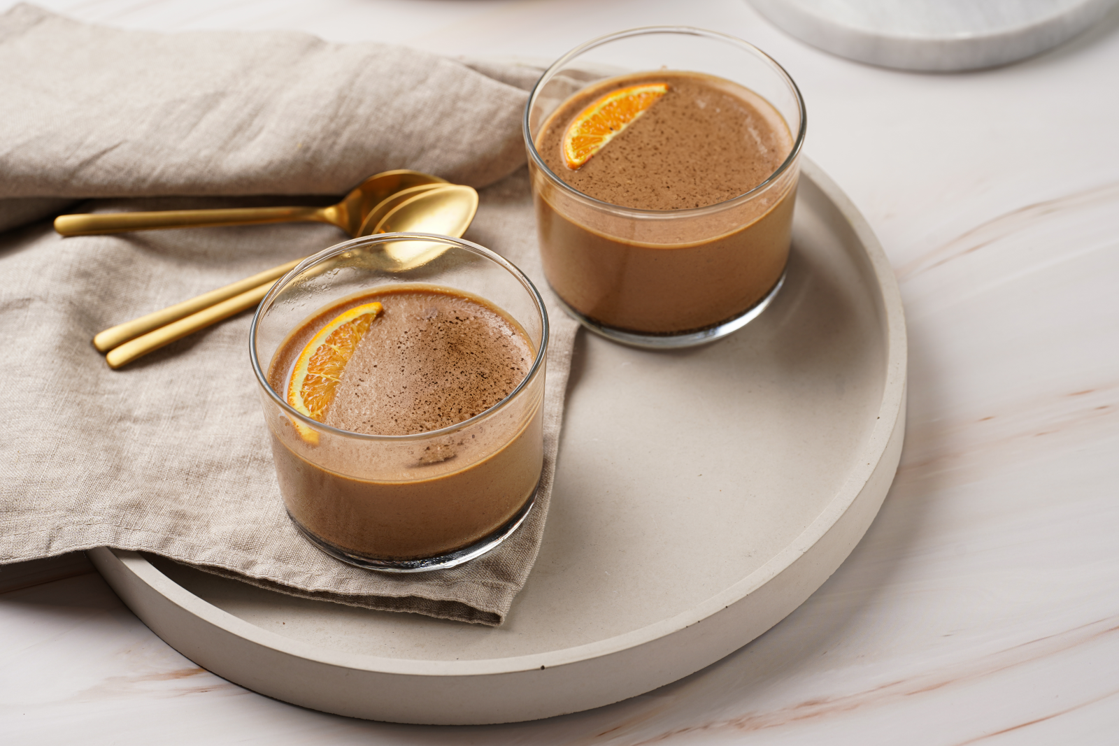 - Tapissez les verrines du mélange endive/spéculoos, recouvrez de mousse au chocolat et décorez d’une rondelle d’orange.