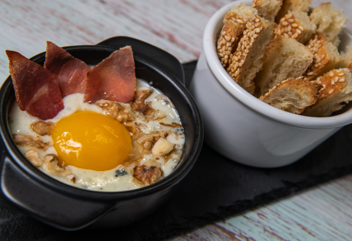 - Ajoutez le roquefort émietté puis cassez délicatement un œuf par-dessus. Poivrez et ajoutez les noix concassées.