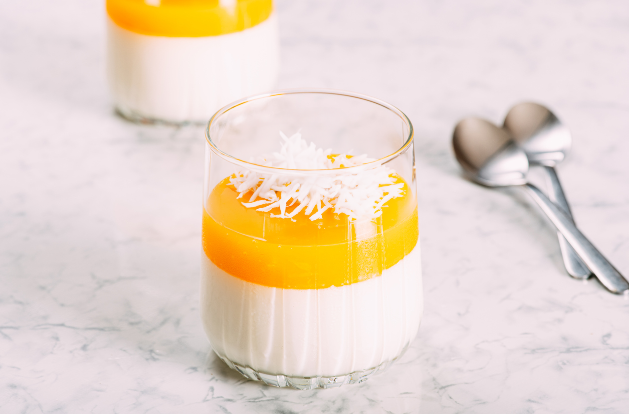 - Une fois que la panna cotta a bien refroidi, versez la pulpe de mangue par-dessus et saupoudrez de noix de coco râpée.