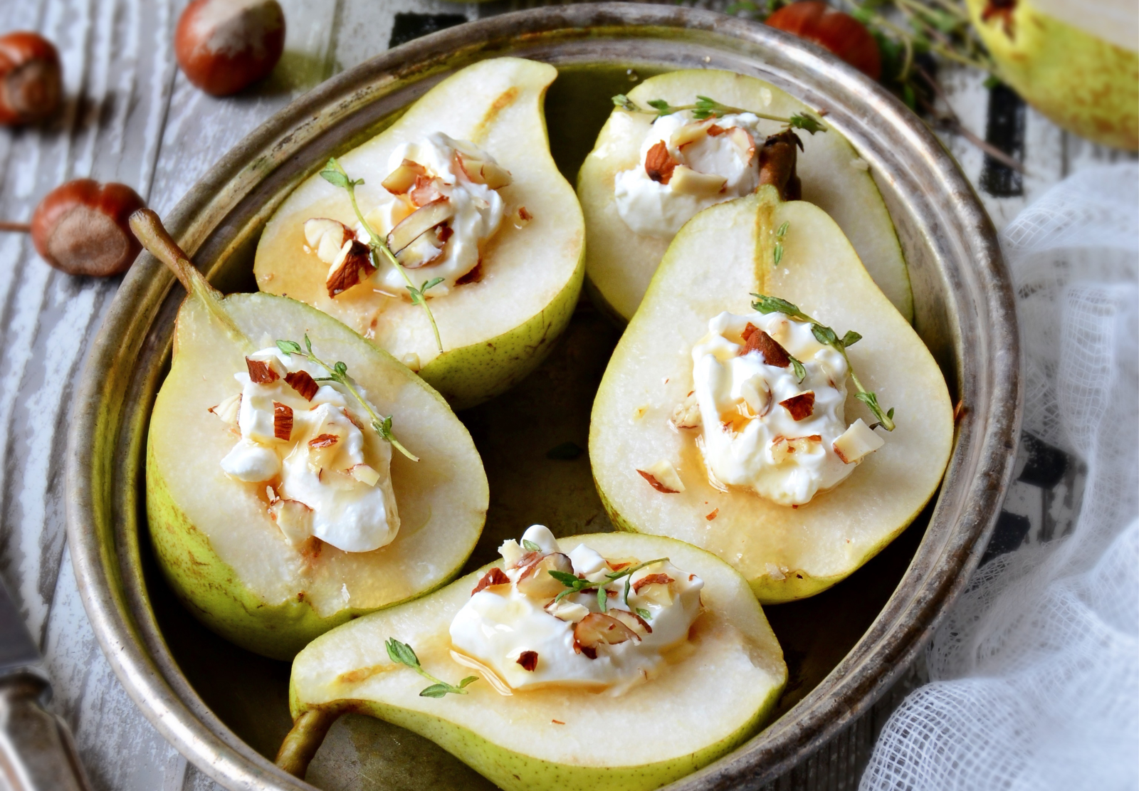 Astuce : coupez une toute petite tranche sous la demi-poire pour qu’elle puisse tenir bien à plat.