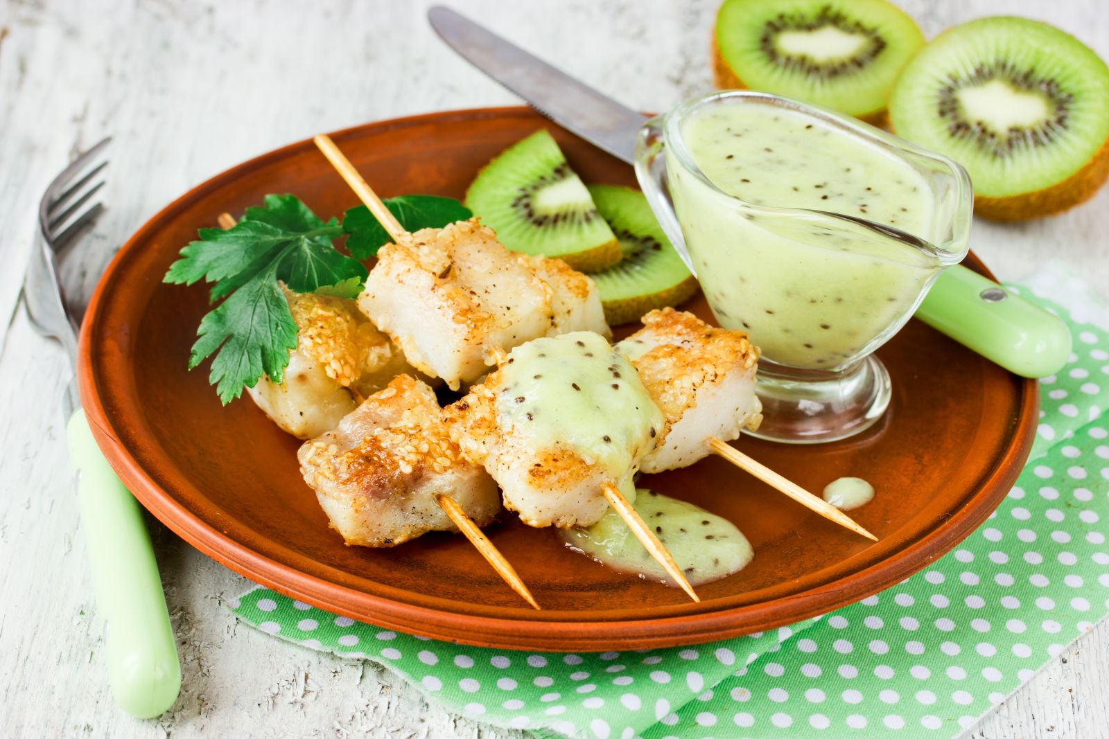 Il est temps de dresser : disposez les brochettes de poisson dans une assiette puis versez la sauce au kiwi dans un récipient à part. Le meilleur moment arrive ensuite : la dégustation !
