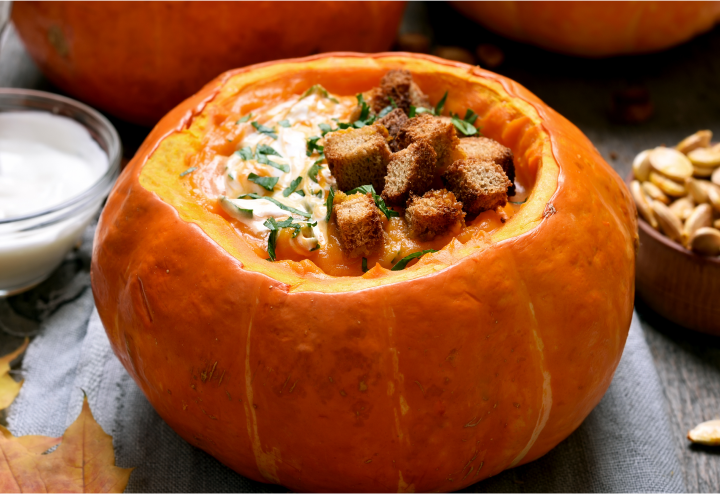 Envie d’un plat réconfortant ? On a ce qu’il vous faut : un potimarron farci au cantal et ses croutons bien dorés :