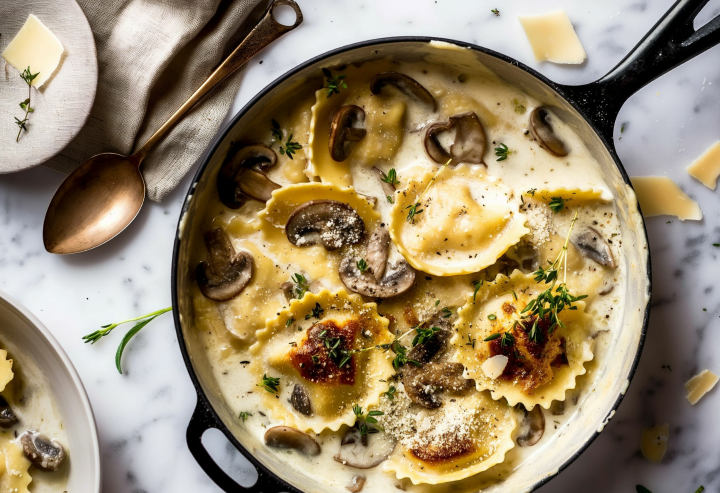 - Plongez les raviolis dans un grand volume d’eau salée frémissante pendant 5 min. Égouttez puis mélangez avec la sauce aux champignons.