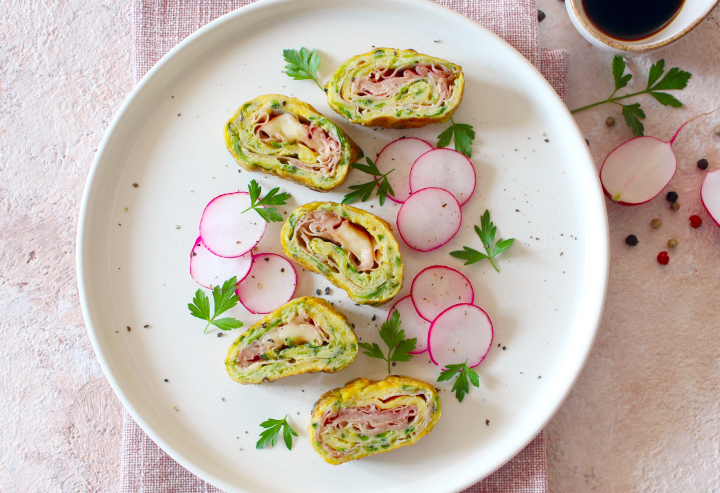 - Déposez une tranche de jambon sur un bord de l’omelette. Roulez délicatement l’omelette à l’aide d’une spatule.