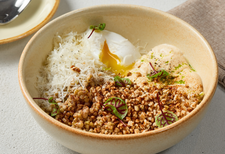 - Dans un bol, déposez le sarrasin refroidi, le brie fouetté et l’œuf mollet.