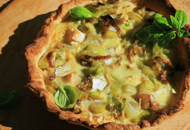 - Répartissez les poireaux sur le fond de tarte puis les tranches de brie et le mélange à la crème.