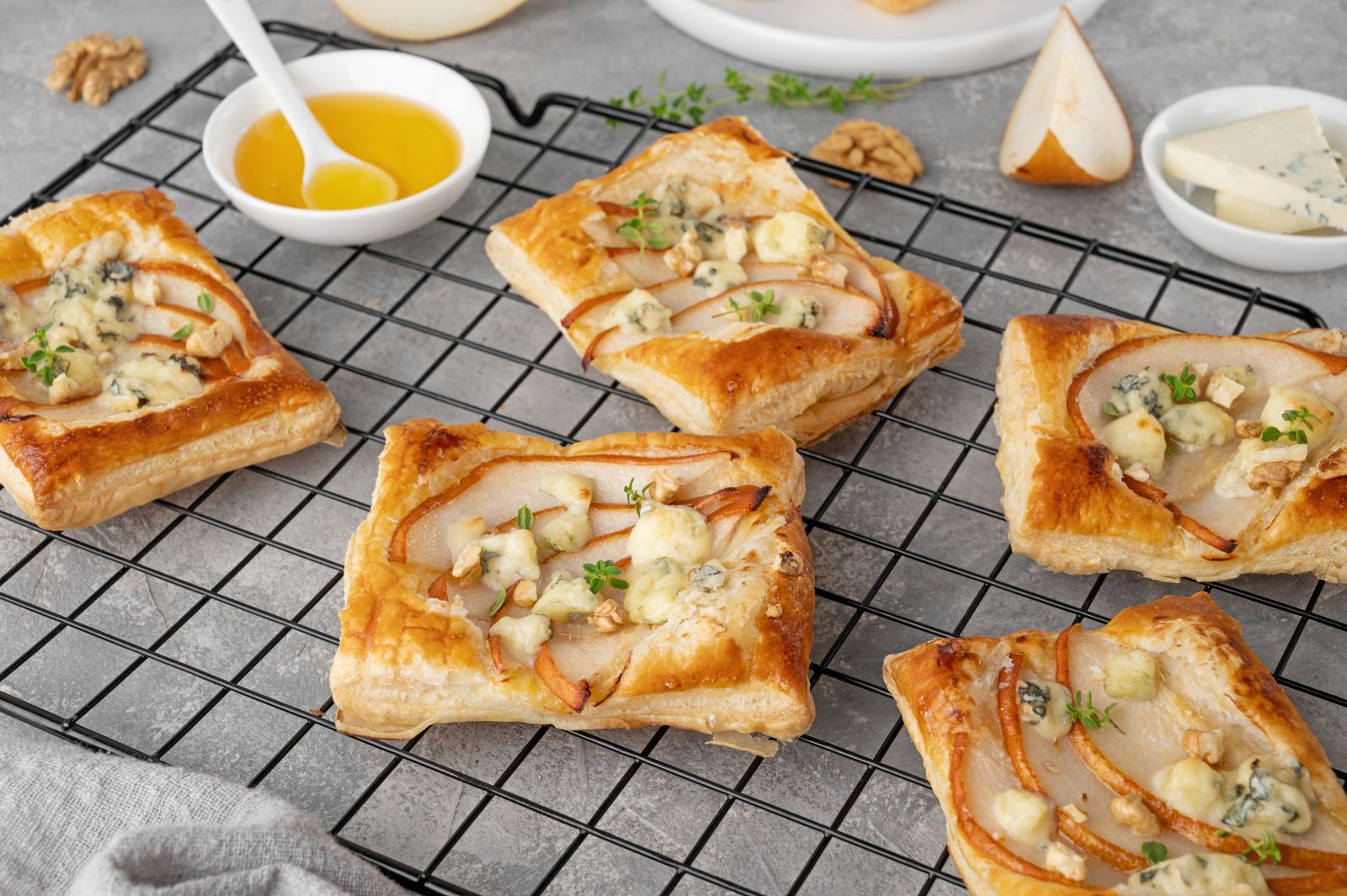 - Déposez des tranches de poire sur chaque morceau de pâte feuilletée et émiettez le roquefort par-dessus.