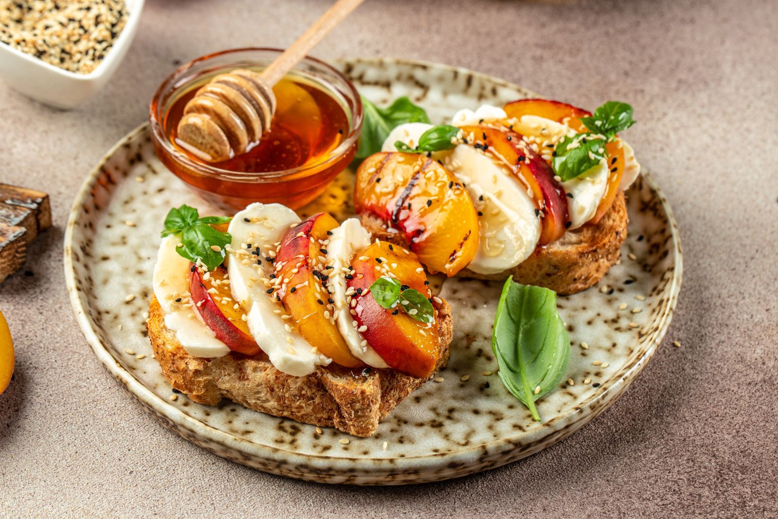 - Versez un filet de miel, saupoudrez de graines de sésame puis terminez avec quelques feuilles de basilic.
