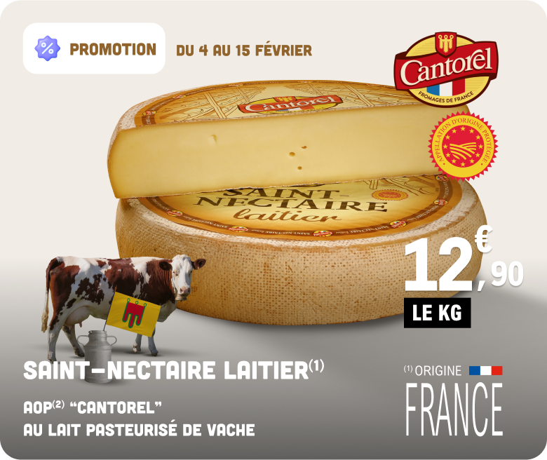 Le Saint-Nectaire AOP(2) Laitier Cantorel est fabriqué dans le plus pur respect de sa recette, à base de lait pasteurisé offrant ainsi des arômes particulièrement riches.